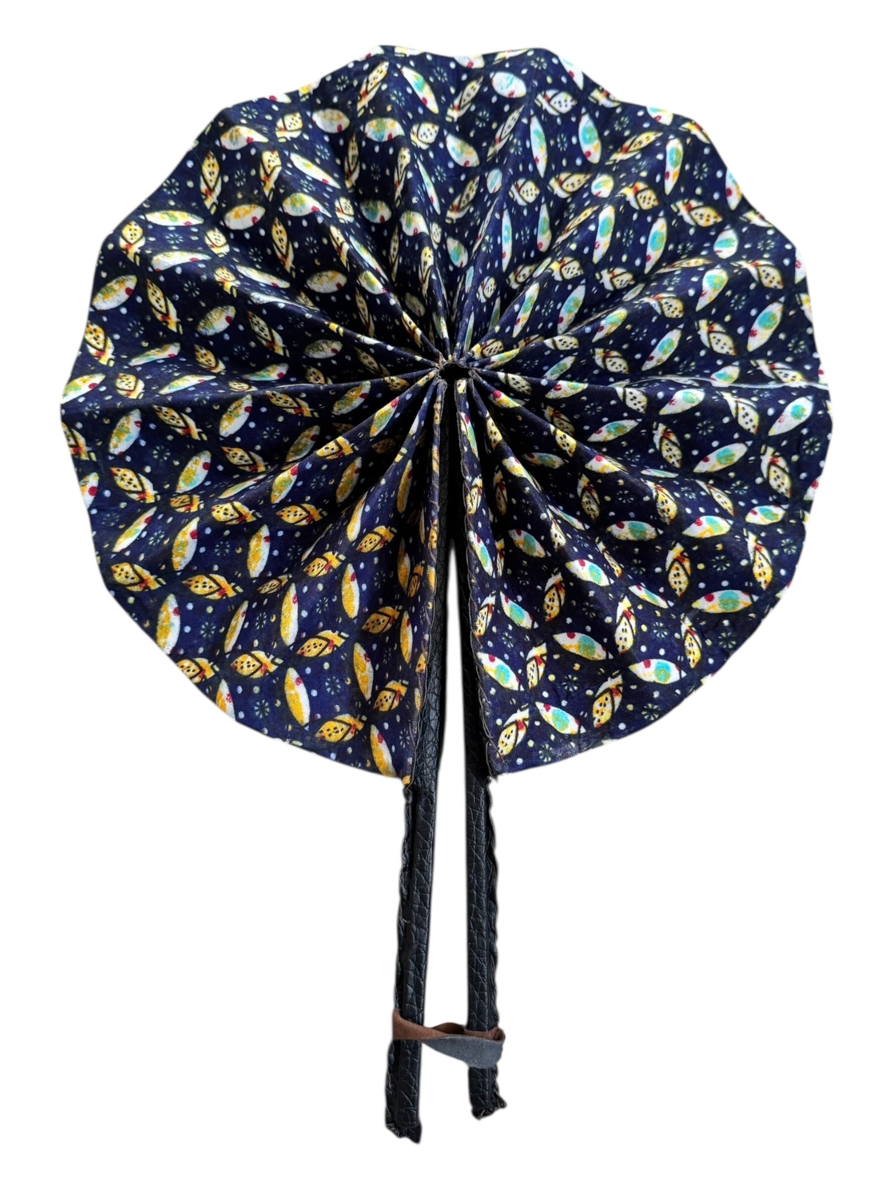 Each foldable fan is made using traditional wax print fabrics, leather-bound handles, and a secure strap – perfect for warm days, summer festivals, weddings, or cultural celebrations. Lightweight, compact, and bold in design, these fans are both practical and wearable art.